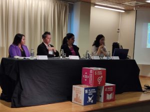 Tras unas palabras de la directora de FISC, Blanca González, la mesa se inició con la presentación de Ana Fernández Moya, Coordinadora de Proyectos en la ONGD SED, que ha abordado el tema desde el punto de vista de la Cooperación Internacional compartiendo datos alarmantes como que durante la pandemia, por cada tres meses de confinamiento, se han dado quince millones adicionales de casos de violencia de género, como confirma el Fondo de Población de las Naciones Unidas, y explicando en qué consiste la interseccionalidad de género así como los distintos tipos de violencia que existen en el mundo.