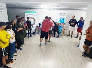 Llegamos, pero primero de todo, un clásico madrileño antes de empezar el montaje: un café con porras. Ahora sí, accedemos a la Nave de Terneras, una gran Nave con un escenario y nada más. Un espacio frío. Pero sabemos que poco a poco acabará siendo un cálido espacio. Empezamos poniendo sillas, en total ponemos 216 sillas. La Nave ya no está tan vacía. Ahora hace falta irla llenando. Y como hormiguitas, todos nos ponemos a hacer diferentes tareas: que si poner roll ups, que si preparar las fotos, que si colgar las fotos, decorar el escenario, hinchar globos… y sin darnos cuenta el reloj marca ya las tres de la tarde. Miramos la Nave, ahora si que es un espacio cálido. Solo falta que venga lo más importante: Los amigos y amigas de la FISC. Hacemos un receso para ir a picotear alguna cosa, pero rápidamente de vuelta, hay que hacer los últimos retoques. Empiezan a llegar amigos y amigas de la FISC. Vienen del norte, vienen del sur, de tierras lejanas, de tierras próximas, todas con un objetivo común: celebrar los 30 años de camino de la FISC.